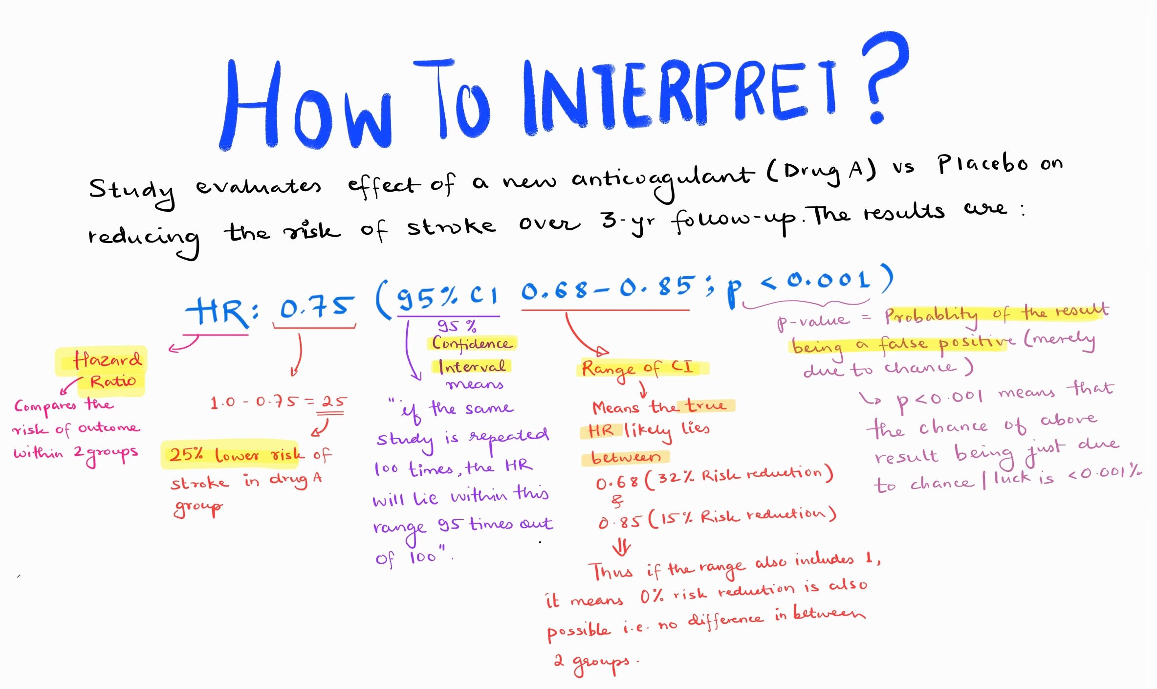 HR = 0.8 (95% CI: 0.7–0.9) → Treatment reduces risk by 20%, and the true effect is between 10–30%.